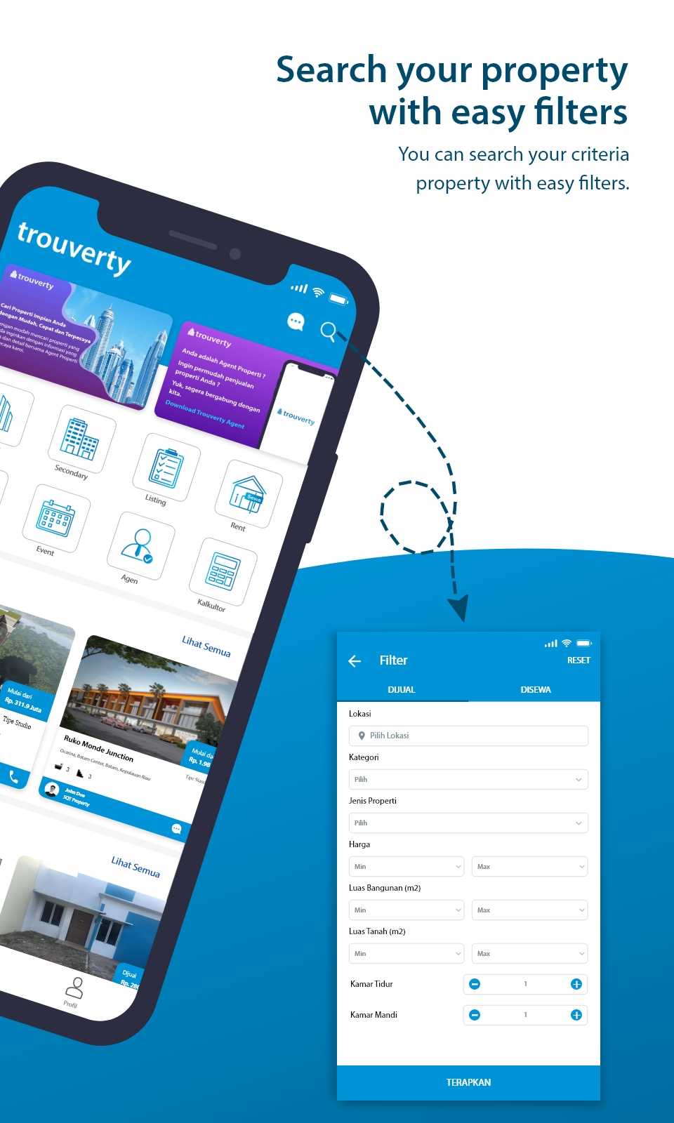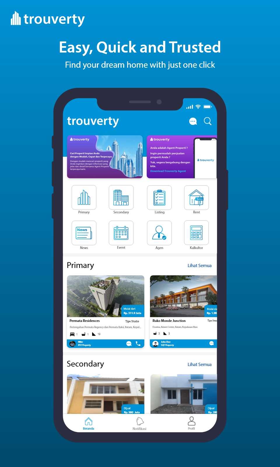 Trouverty is a real estate application that offers property searches for properties in Indonesia. You can easily adjust your search to find properties that fit your criteria. Get all the important things and much more like photos, detailed information about property, facilities, e-brochures, pricelists, and even agent details. You can easily choose properties and contact the agent by phone or by using the chat feature directly.